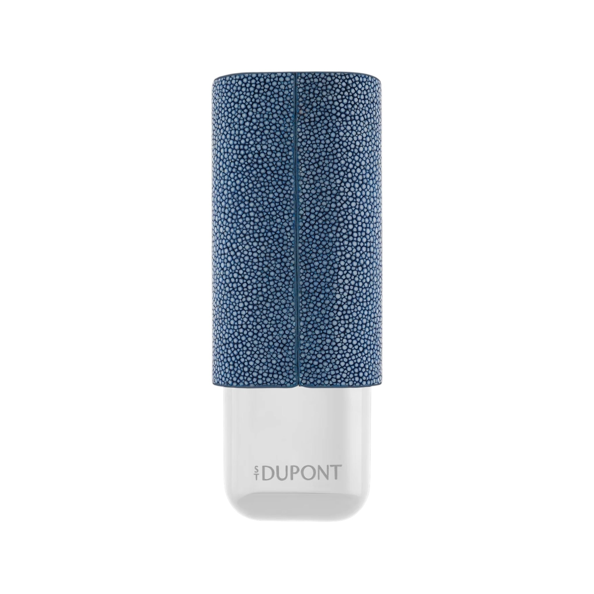 Blue smooth cowhide leather lighter case, accommodates a Line 2 lighter. Embossed with the S.T. Dupont logo and blue, white, red stitching.
