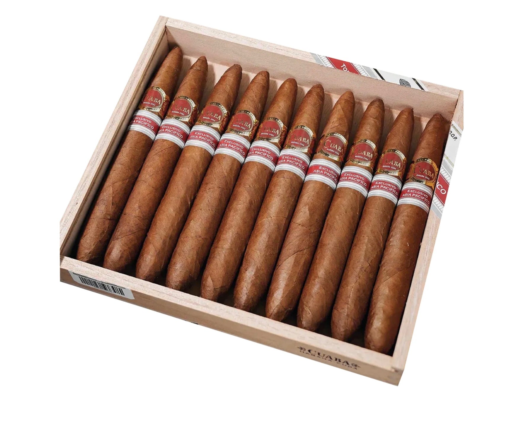 Experience the Cuaba APAC, a perfecto cigar measuring 6 1/4 inches (158mm) in length with a 47 ring gauge. Also known as Tacos, this vitola is renowned for being used in both the Partagás Presidentes and the Hoyo de Monterrey Elegantes, and has recently been featured in the Ramón Allones Perfecto, an exclusive Edición Regional for Mexico. One of the newer additions to Habanos S.A., the Cuaba brand offers only perfecto vitolas in its regular production sizes and is known for its medium to full flavor. Don't miss out on this exclusive cigar, produced in a limited quantity of 8,888 boxes of 10 by Pacific Cigar Ltd.