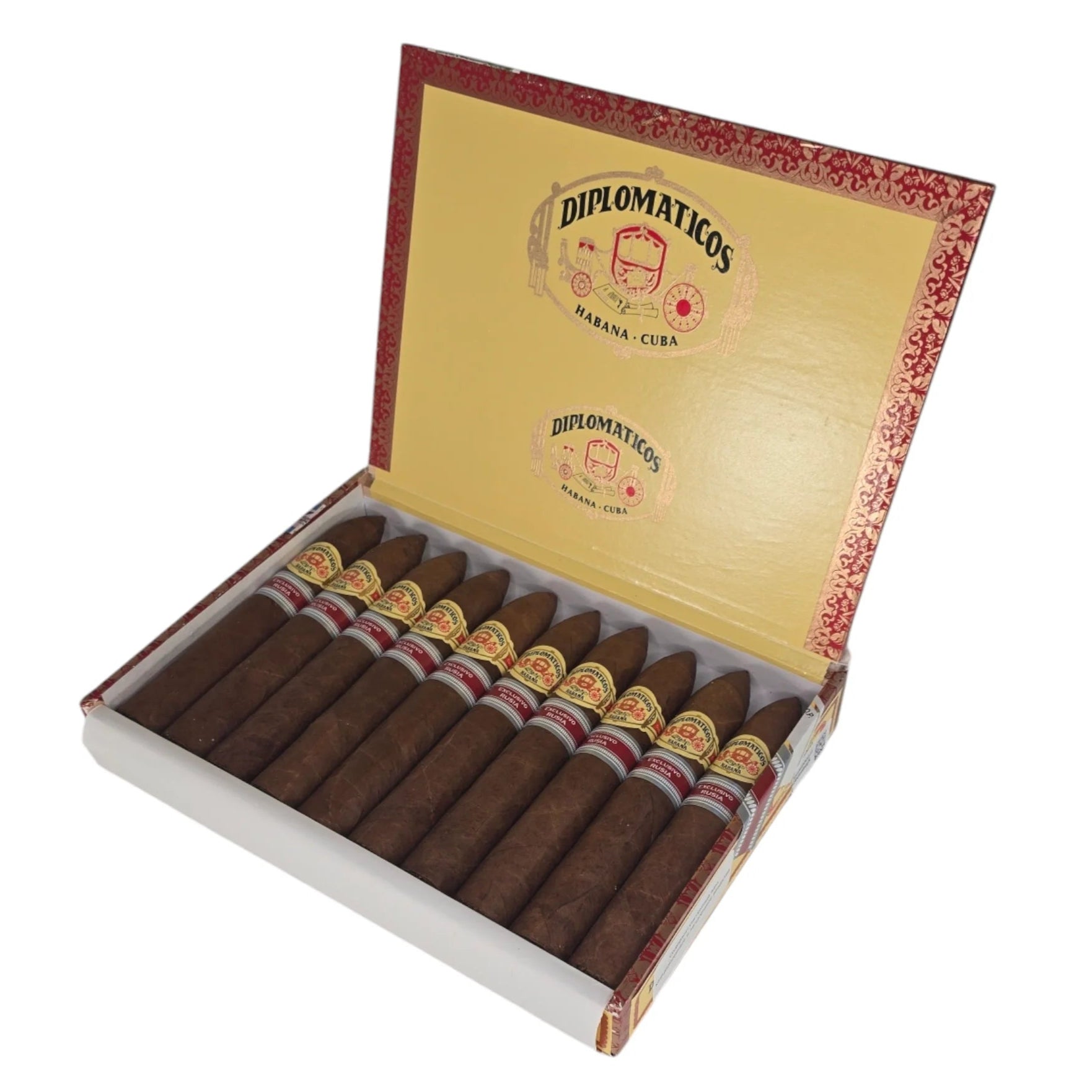 Released in 2021 as an exclusive Regional Edition for Russia, the Diplomáticos Protocolo is a rare and collectable Cuban cigar, with only 6,000 numbered boxes produced. Presented in the classic Campanas factory vitola (popularly known as Belicoso), it measures 140 mm in length with a 52-ring gauge, delivering a refined, full-bodied smoking experience that reflects Diplomáticos’ tradition of craftsmanship and innovation.